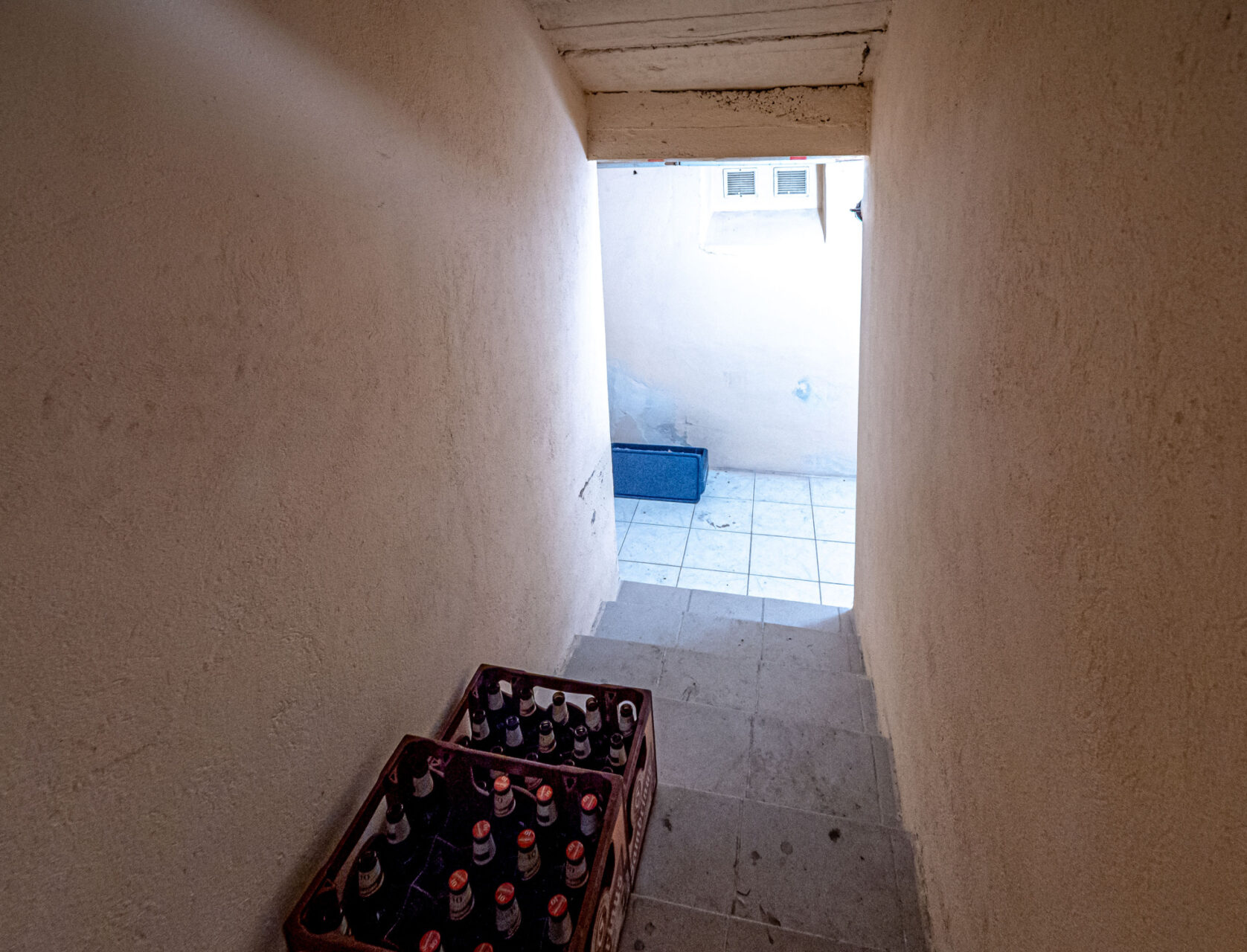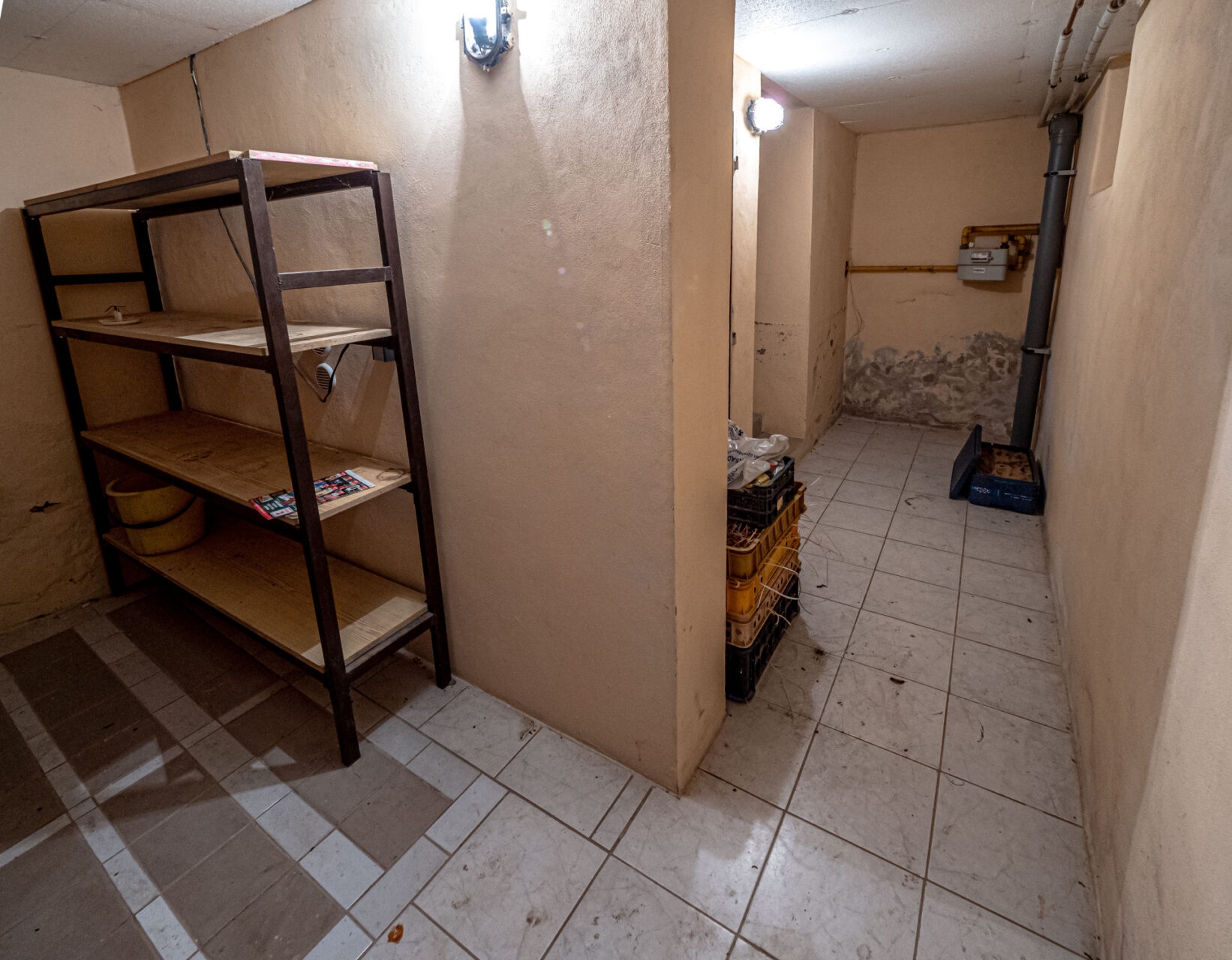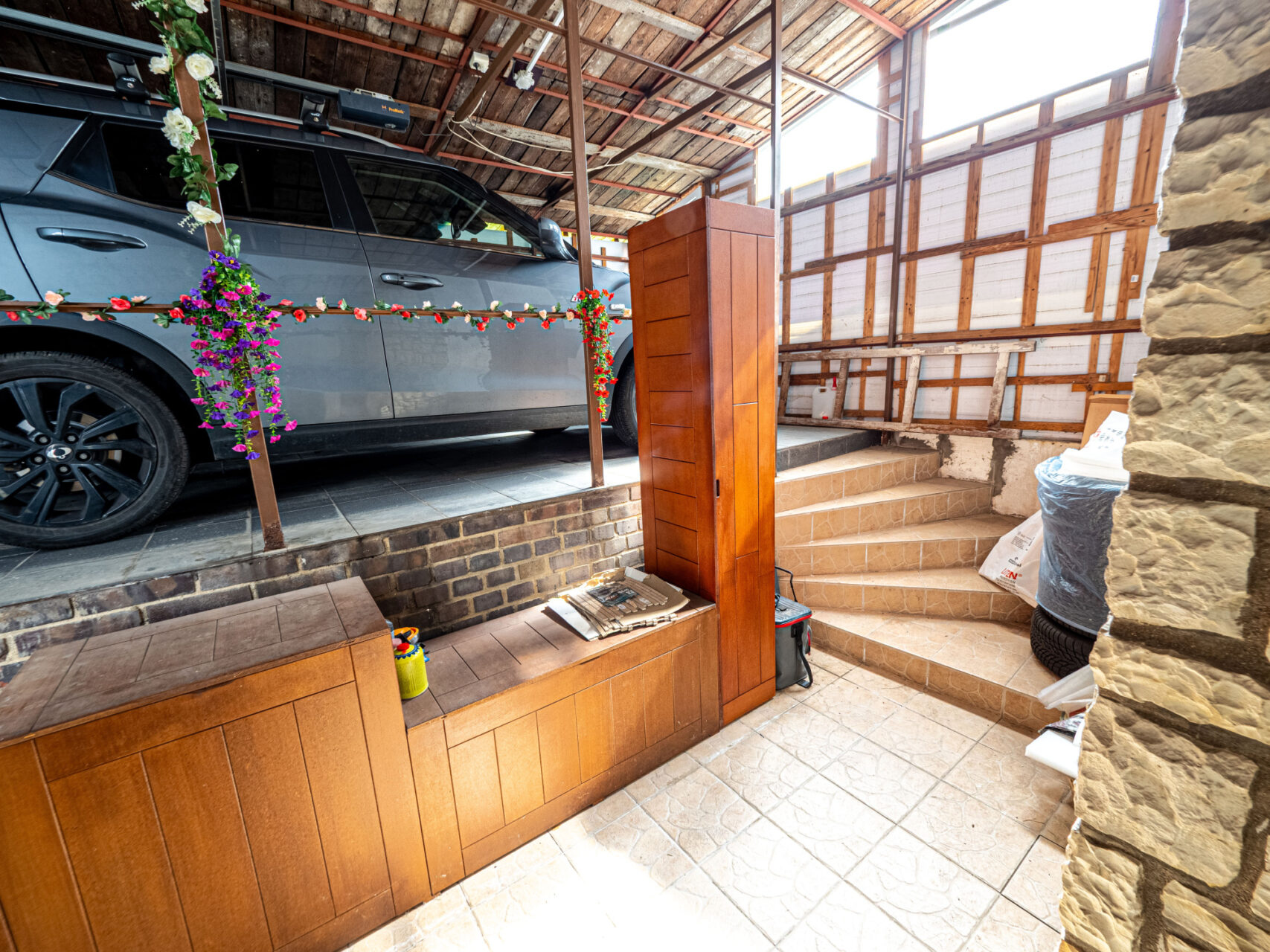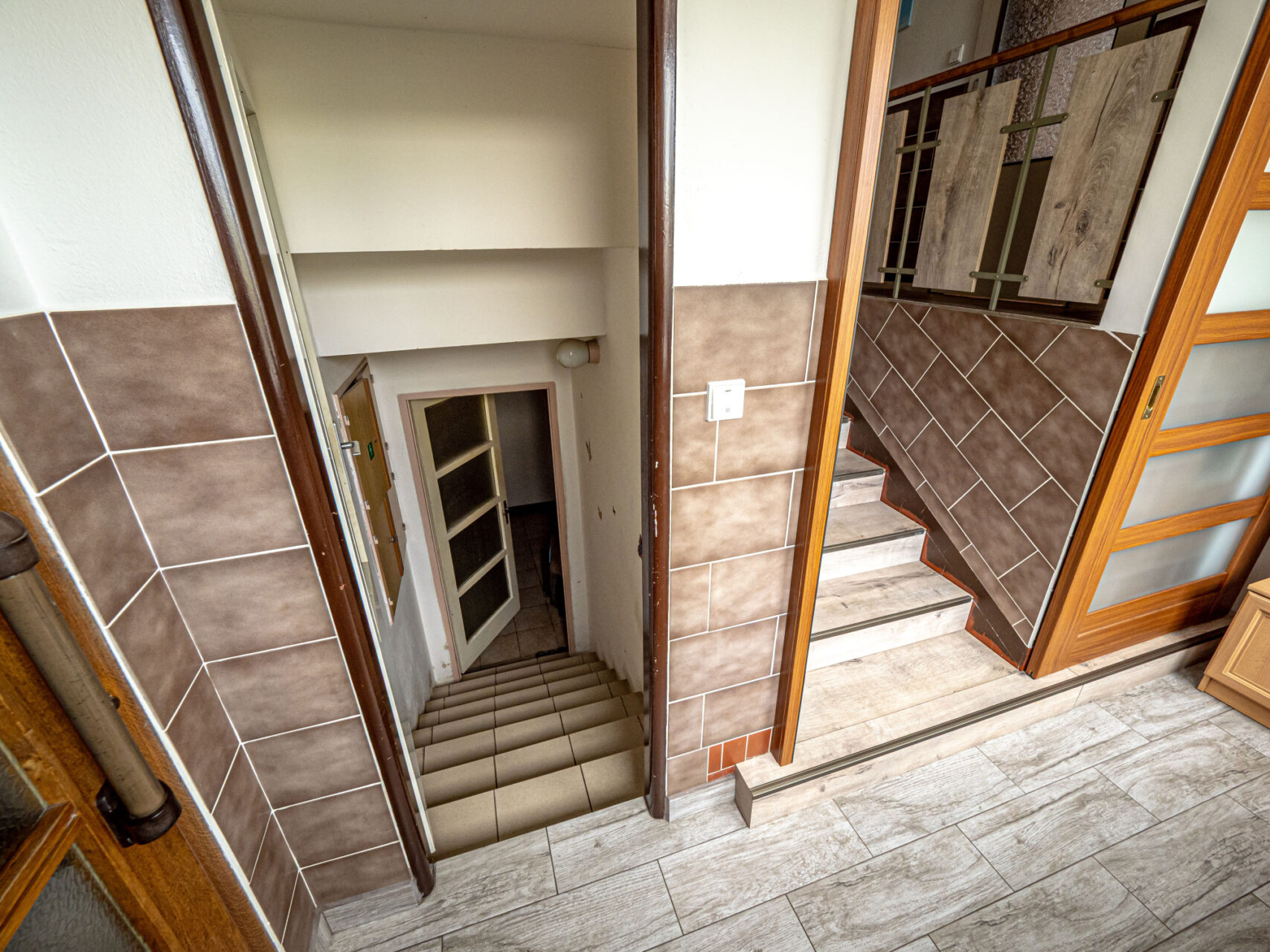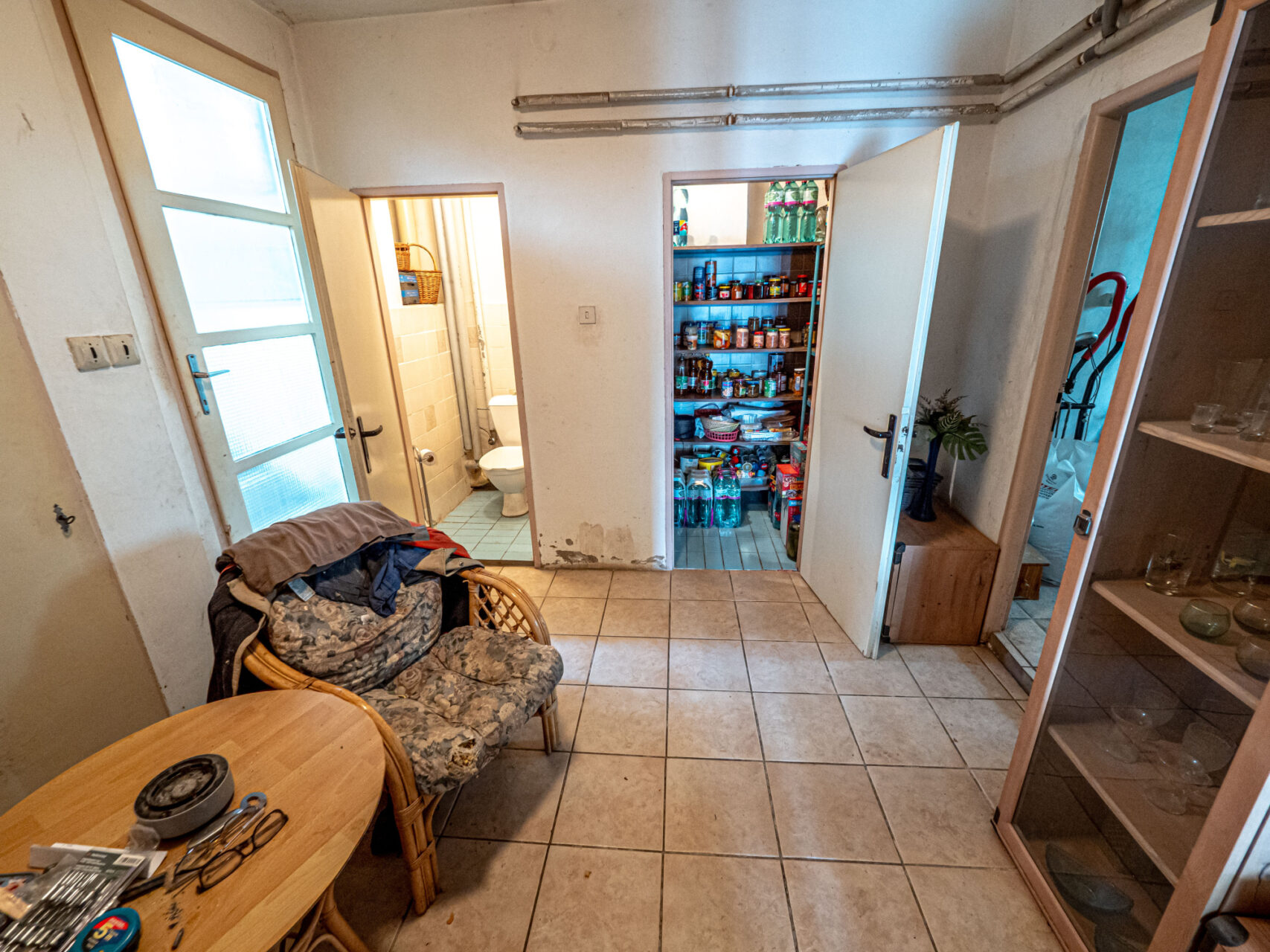 Dolní patro se nachází na úrovni zahrady a je využito jako zázemí domu. Jsou zde technická místnost, úklidová místnost, dílna, prádelna, 2x sklad, WC a sprchový kout, v případě potřeby je možné ho upravit k obytným účelům. Ze tří místností je zajištěn samostatný vstup na zahradu přes krytou terasu rozprostírající se po celé přední fasádě domu, součástí této terasy je i gril s udírnou, ideální místo pro venkovní posezení. Nachází se tu i vstup do sklepa, který se využívá pro skladování, je suchý a je ve velmi dobrém stavu.