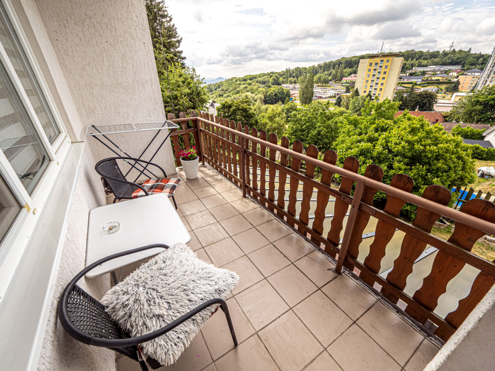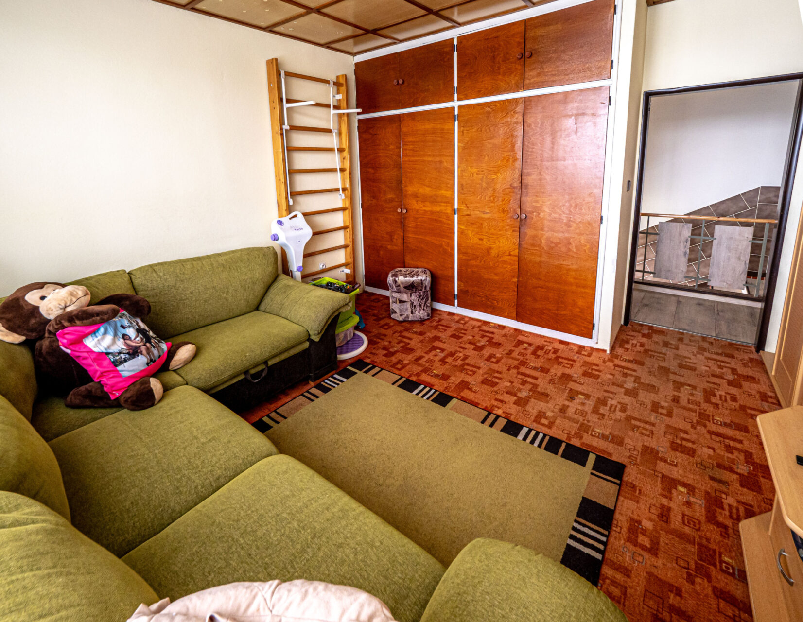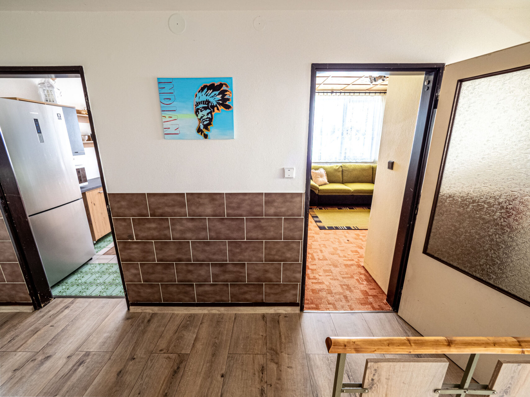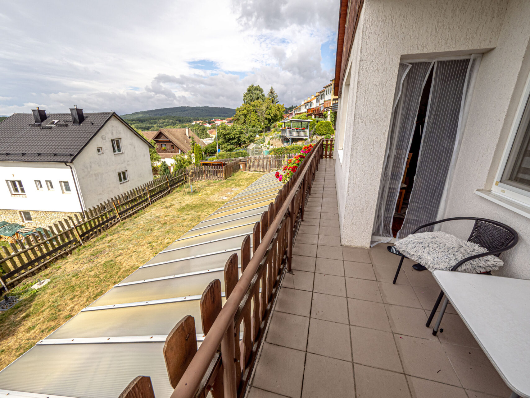 Horní patro je využito k bydlení, jsou zde kuchyň s kuchyňským koutem, obývací pokoj, ložnice, pokojík, koupelna, WC, sklad a úklidová komora a schodiště na prostornou půdu, která je zatím nevyužitá, ale je možné jí přebudovat na další obytné místnosti. Přes celou čelní stranu domu je prostorný balkón.