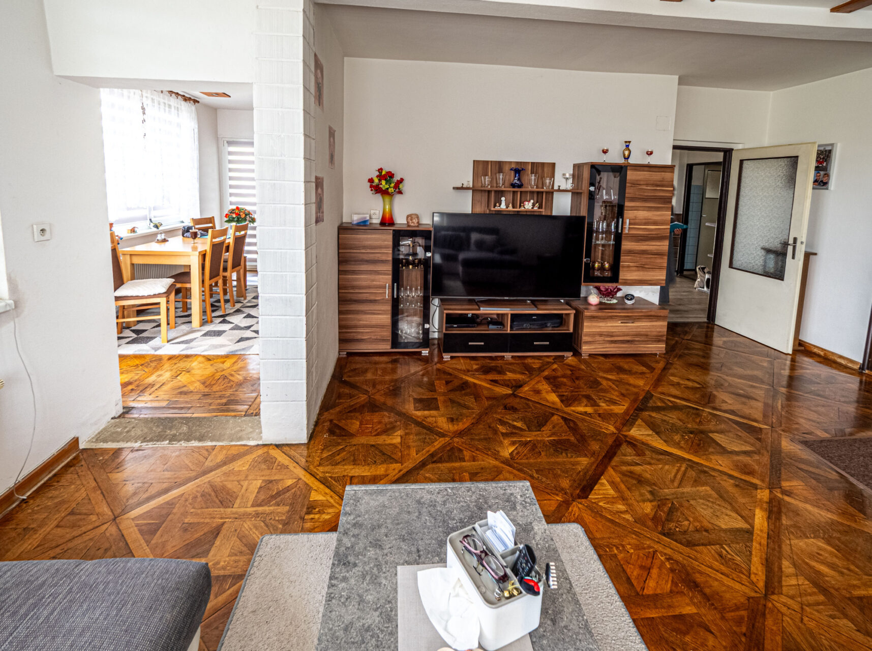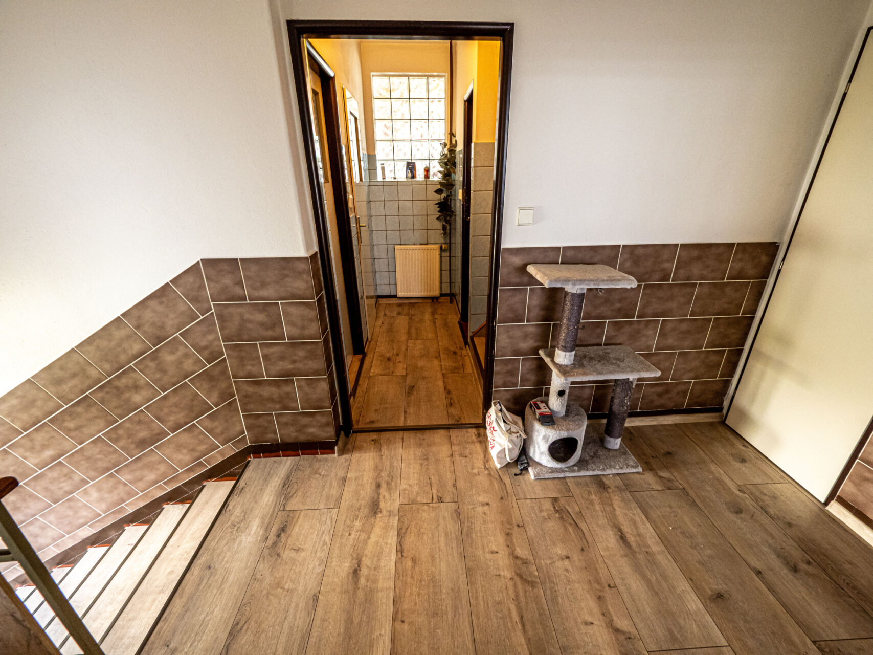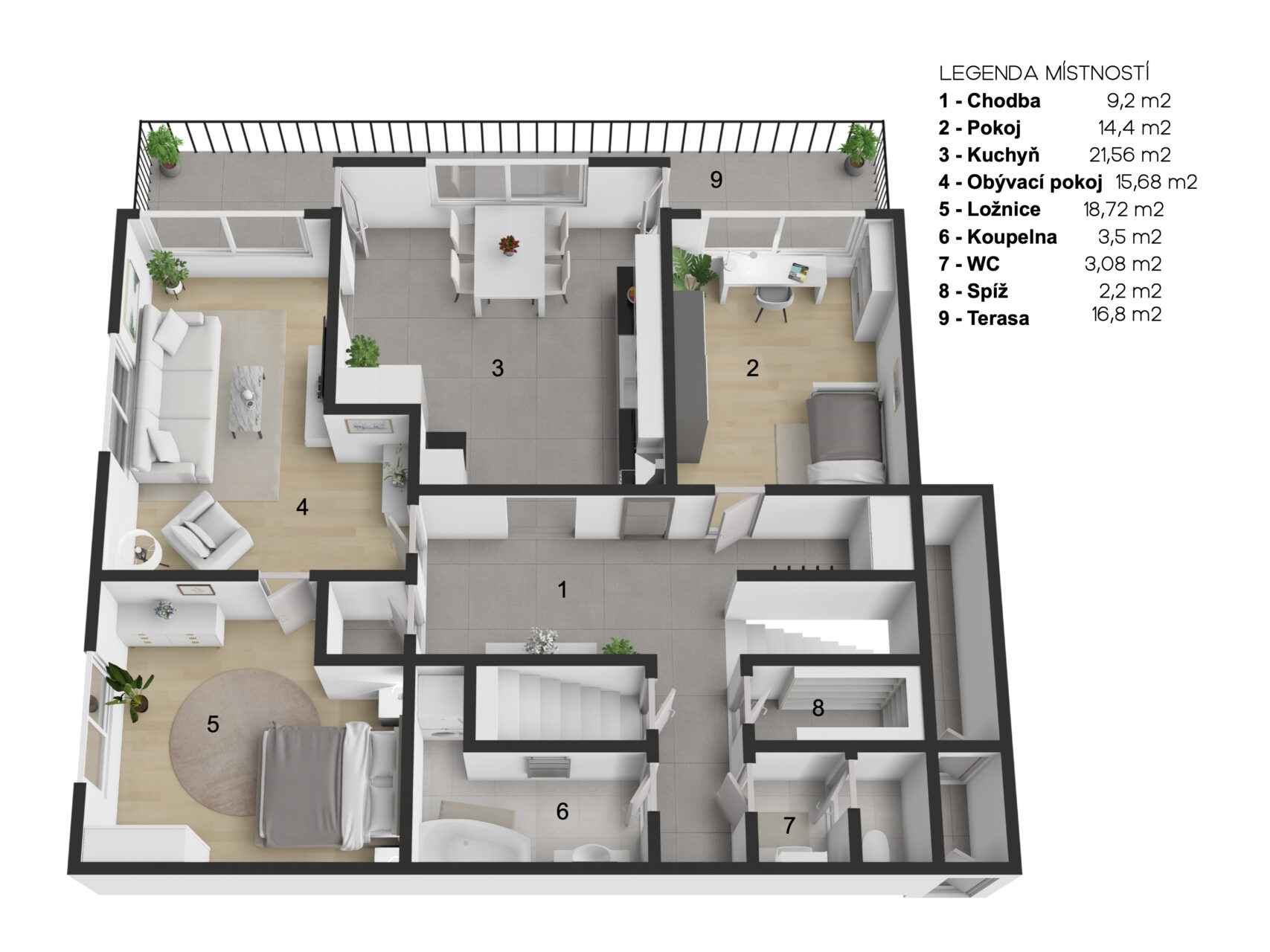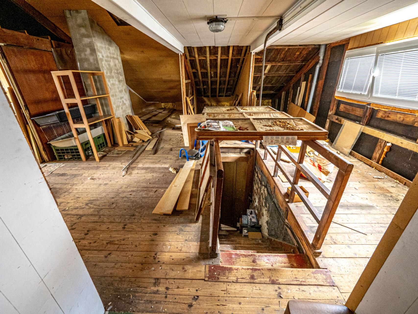 Horní patro je využito k bydlení, jsou zde kuchyň s kuchyňským koutem, obývací pokoj, ložnice, pokojík, koupelna, WC, sklad a úklidová komora a schodiště na prostornou půdu, která je zatím nevyužitá, ale je možné jí přebudovat na další obytné místnosti. Přes celou čelní stranu domu je prostorný balkón.