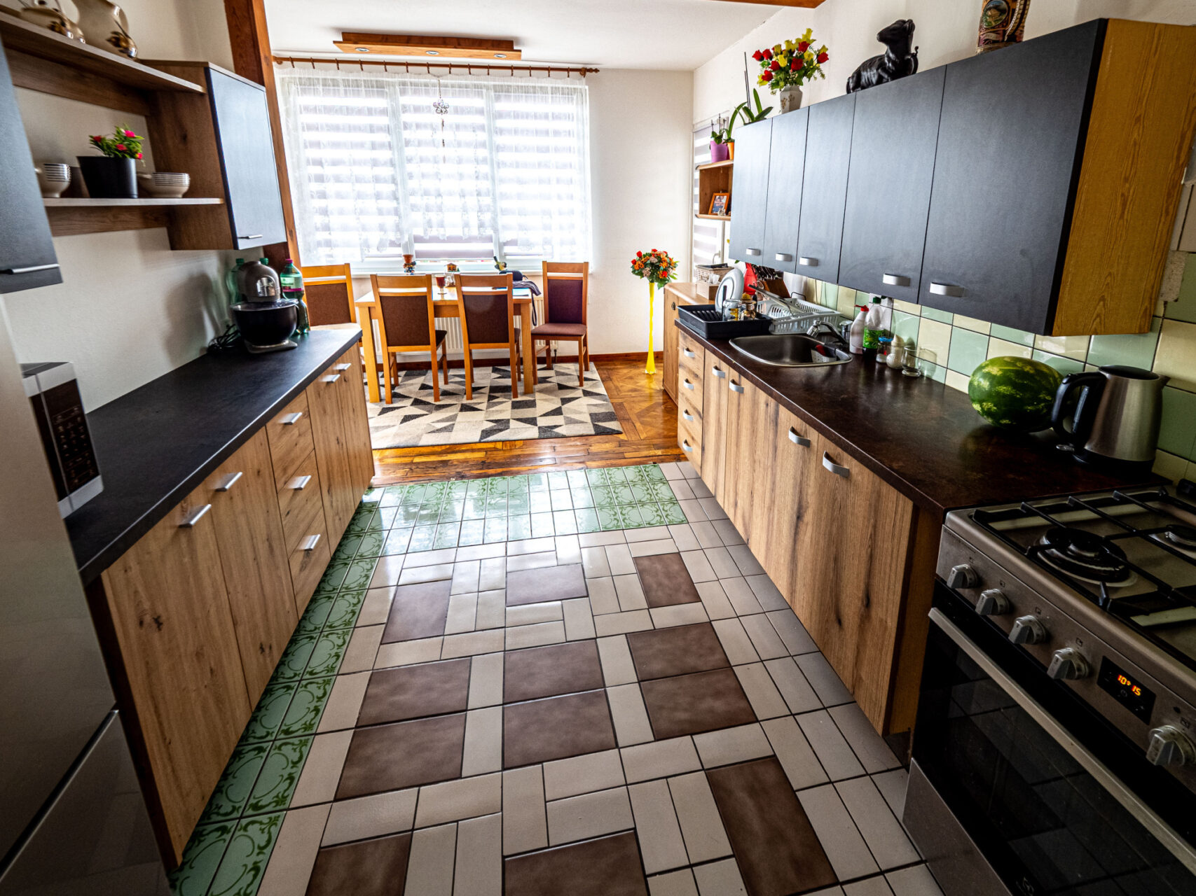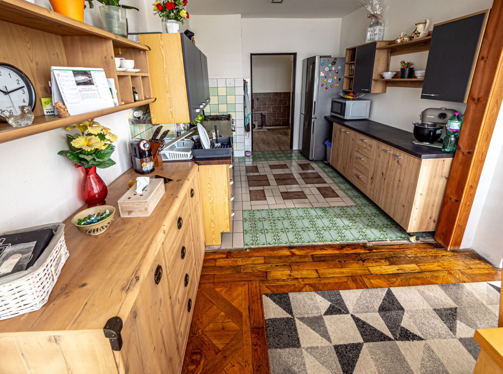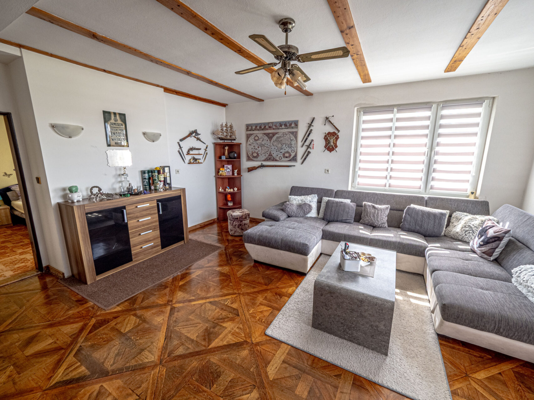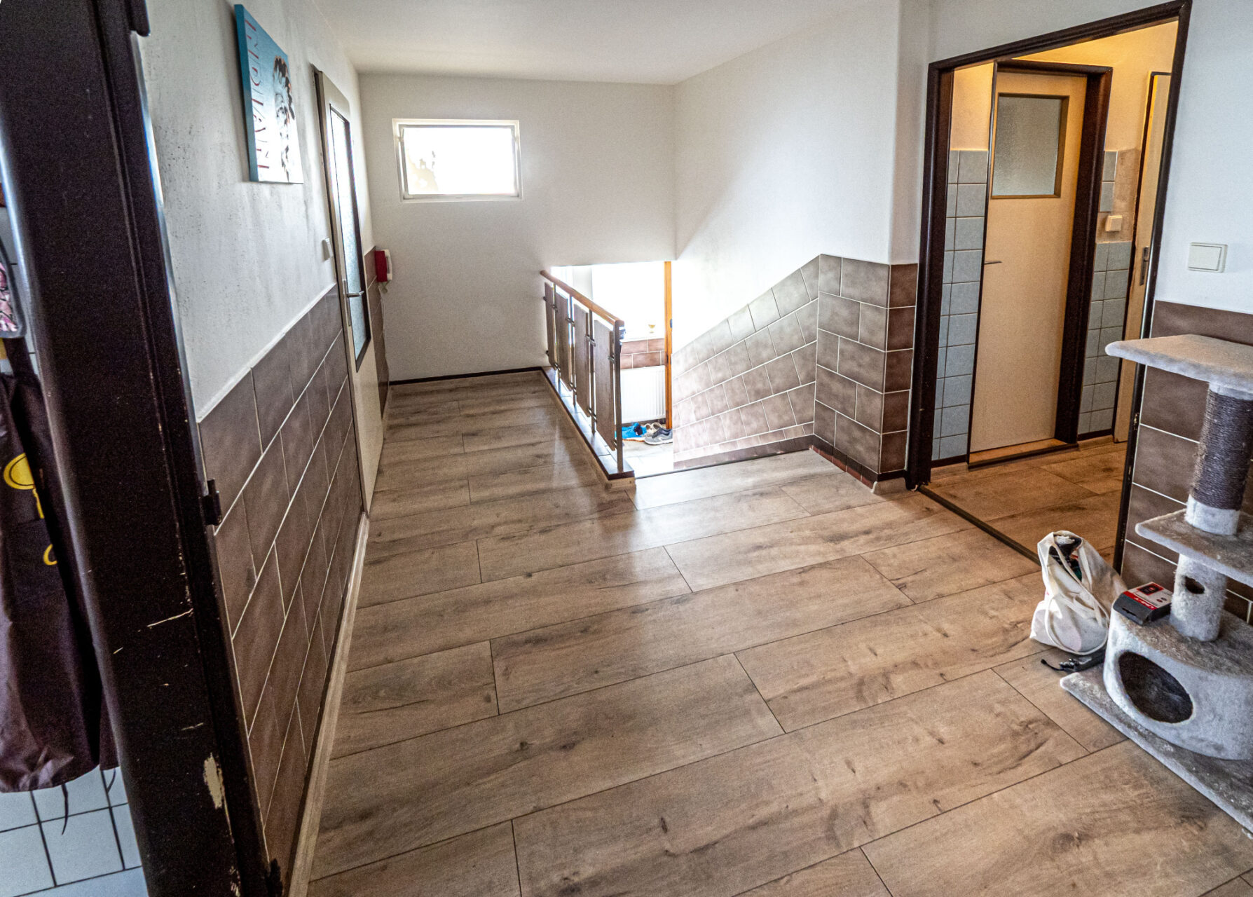 Horní patro je využito k bydlení, jsou zde kuchyň s kuchyňským koutem, obývací pokoj, ložnice, pokojík, koupelna, WC, sklad a úklidová komora a schodiště na prostornou půdu, která je zatím nevyužitá, ale je možné jí přebudovat na další obytné místnosti. Přes celou čelní stranu domu je prostorný balkón.